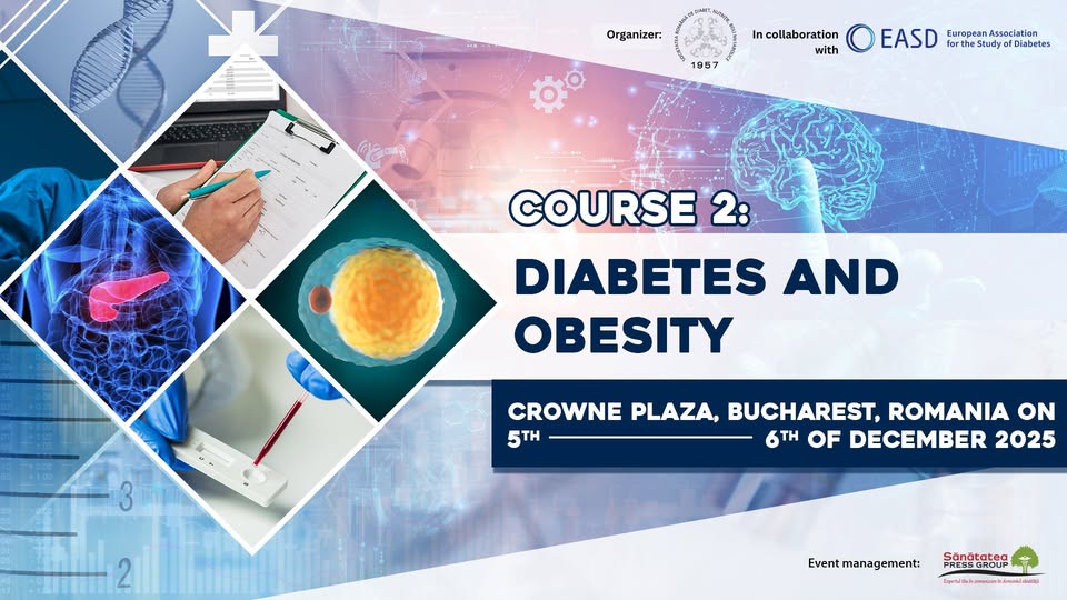 Vă așteptăm, alături de Societatea Română de Diabet, Nutriție și Boli Metabolice, la cea de-a doua conferința organizată în colaborare cu European Association for the Study of Diabetes – EASD în 2025, care aduce în prim-plan două dintre cele mai mari provocări de sănătate publică: DIABETUL și OBEZITATEA.