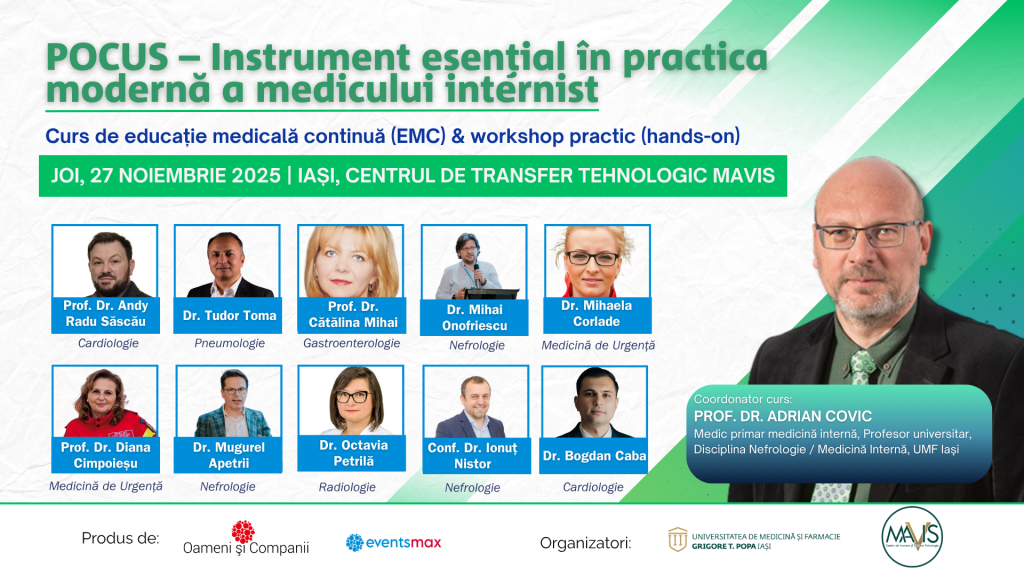 Pe 27 noiembrie 2025, la Centrul de transfer tehnologic MAVIS, UMF Iași, Clădire Leon, etaj 12, va avea loc Cursul POCUS – Instrument esențial în practica modernă a medicului internist, un eveniment de educație medicală continuă (EMC), organizat sub egida Universității de Medicină și Farmacie „Grigore T. Popa” din Iași.